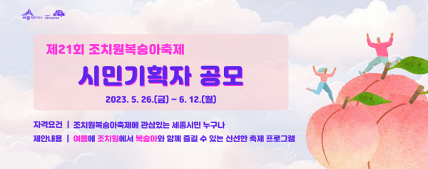 공모주제는 ‘여름에 조치원에서 복숭아와 함께 즐길 수 있는 신선한 축제 프로그램’이다. 개인 또는 팀으로 신청 가능하며, 복숭아축제와 관련된 공연, 전시, 체험 등 모두 가능하다.