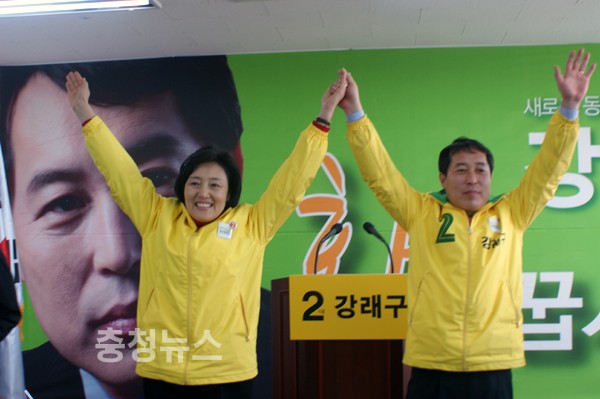 ▲ 박영선 최고위원과 강래구 후보가 총선승리를 다짐하며 만세를 외치고 있다.