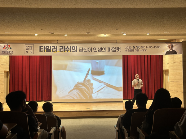 충남도립대는 30일 대학 해오름관에서 타일러 라쉬(Tyler Rasch·미국)를 초청, 재학생들을 대상으로 ‘미라클라이프’ 특강을 진행했다고 밝혔다.