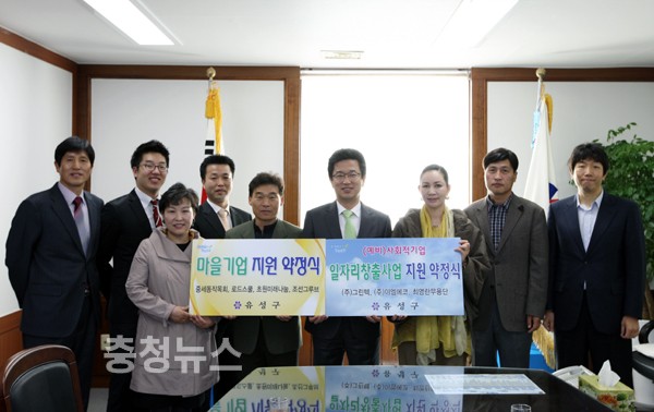 유성구(구청장 허태정)가 29일 지역 일자리 창출을 위해 공모를 통해 선정된 사회적기업과 마을기업 7개 기업과 지원 약정을 체결하고 본격적인 지원에 나섰다.
