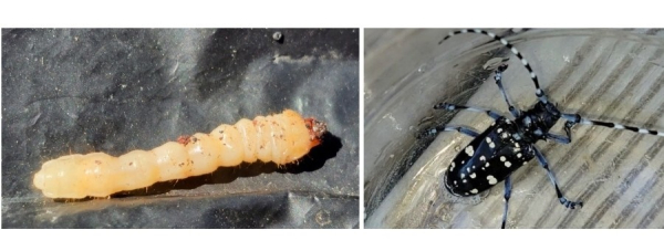 (왼쪽부터)알락하늘소 애벌래와 알락하늘소/천안시 제공
