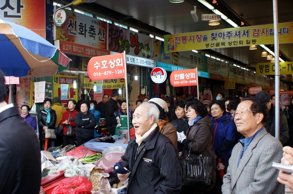 ▲ 100여명의 지지자들과 상인들이 가던길을 멈추고 이회창 前 대표의 연설을 듣고 있다.