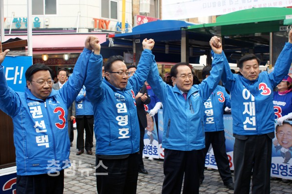 ▲ (왼쪽부터)권선택(중구) 후보, 임영호(동구), 이회창 前 대표, 이재선(서구을) 후보가 만세를 외치고 있다.