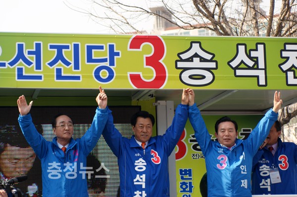 자유선진당 심대평 대표와 이인제 최고위원, 류근찬 후보 등이 4일 오후 유성시장에서 송석찬(유성구) 후보 지원유세에 나섰다.