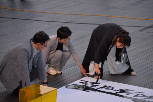 김순자 청보리 캘리디자인 연구소 대표의 “민주로 함께 걸어온 길 다시 가야 할 길”을 캘리퍼포먼스를 실시하여 참석하는 시민들에게 잔잔한 감동을 주었다.