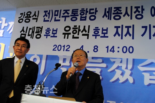 강 前 예비후보는 기자회견에서 "민주통합당으로부터 공천 사기를 당했다"며 "한명숙 대표는 국민경선 약속을 헌신짝처럼 버렸다. 심 후보와 유 후보는 저와 함께 세종시 원안을 지키기 위해 세종시민과 함께 노력했던 인물"이라고 지지 의사를 밝혔다.