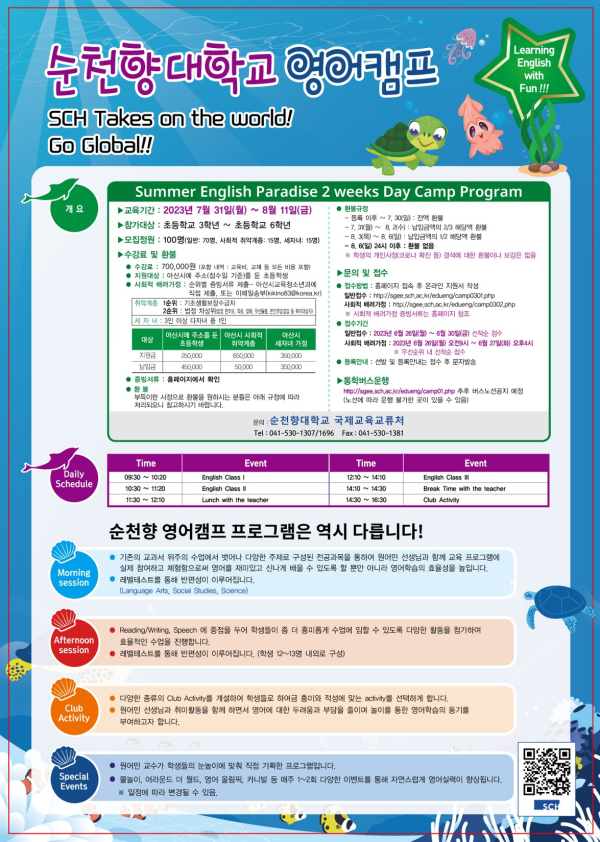 이번 캠프는 미국, 캐나다, 아일랜드, 호주, 남아공 출신의 다년간의 교육 경험이 있는 순천향대 소속 원어민 교수진 30명이 지역 소재 초등학생 3~6학년 총 100명(일반 학생 70명, 사회적 취약계층 학생 15명, 3인 이상 다자녀 가정 학생 15명)을 대상으로 주 5일 2주간 실습 중심의 영어교육을 진행한다.