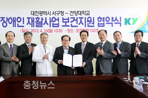 대전시 서구(구청장 박환용)는 지난 16일 건양대학교 보건학관에서 박환용 서구청장, 김희수 건양대학교 총장 등 관계자 10여 명이 참석한 가운데 ‘장애인재활사업 보건지원 협약’을 체결하고 장애인 등 의료 소외계층 주민을 위해 장애인 U-헬스케어사업을 지원하기로 협약했다.