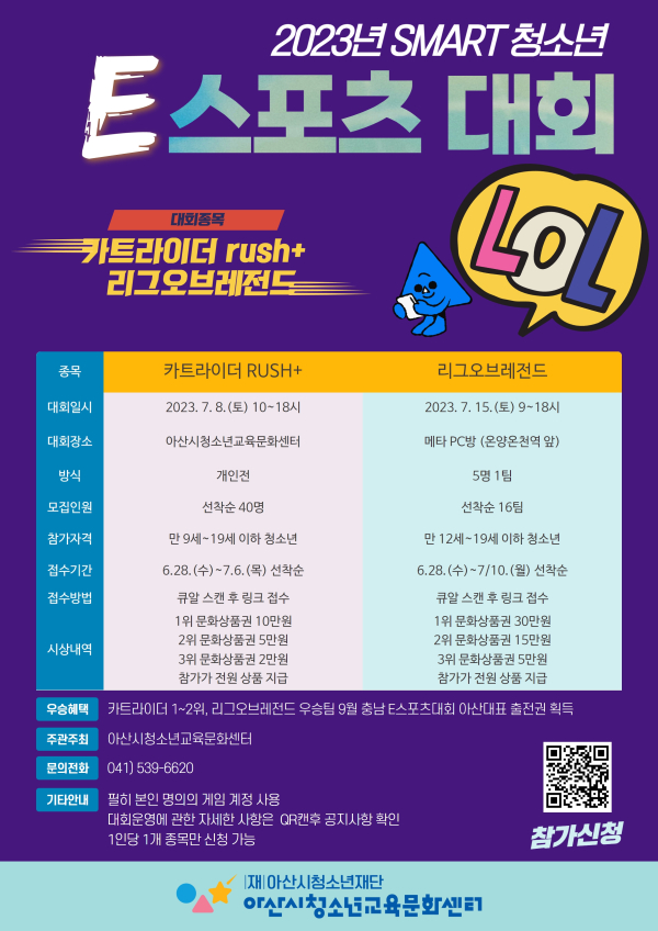 모집 대상은 아산시에 거주하는 청소년이면 누구나 참여 가능하며, 대회 종목은 ‘카트라이더 RUSH+’(만 9~19세), ‘리그오브레전드‘(만 12~19세)다.