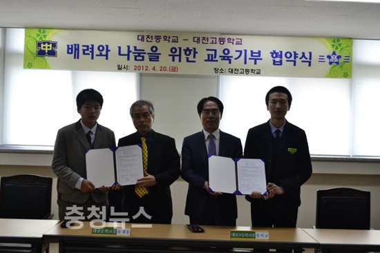 대전고등학교(교장 유의규)는 대전중학교(교장 송재홍)와 20일(금) 10시 대전고 회의실에서 “배려와 나눔을 위한 교육기부 협약식”을 체결했다.