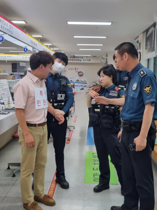 이번 훈련은 특이 민원인에 의해 발생 될 수 있는 돌발행동을 가상한 훈련 상황을 설정하고, 매뉴얼에 따라 상황 발생, 상급자 적극 개입 민원인 진정, 피해 공무원 보호 및 방문 민원인 대피, 비상벨 호출 및 경찰 출동 등 단계별 행동요령 숙지와 대응력 제고에 중점을 두고 실시됐다.