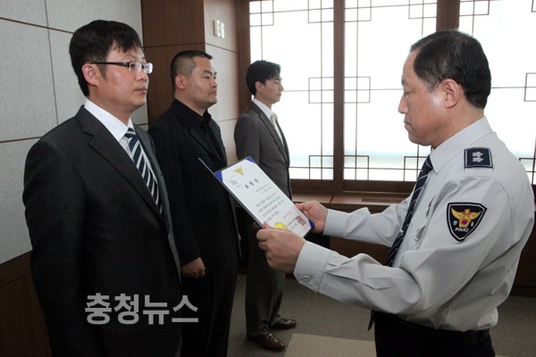 토지분양사기단 검거한 황재호 경관 등 3명 포상 이상원 대전지방경찰청장은 23일 오전 청사 7층 중회의실에서 지휘부가 참석한 가운데 조폭 낀 토지분양사기단 검거 유공으로 지방청 광역수사대 황재호 경관 등 3명에게 포상 및 포상휴가, 즉상금을 수여했다. ▲ 이상원 청장이 유공자들에게 포상을 하고 있다. 저작권자 © 충청뉴스 무단전재 및 재배포 금지 서지원 다른기사 보기 기사가 마음에 드셨나요? 충청뉴스 좋은 기사 후원하기 1,000원 3,000원 5,000원 10,000원 30,000원 50,000원 직접입력 비회원 약관동의하기 ※ 소중한 후원금은 더 좋은 기사를 만드는데 쓰겠습니다.