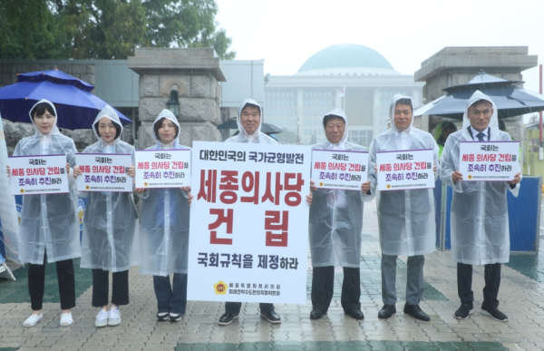이날 김동빈 위원장을 비롯한 이현정 부위원장, 김광운, 김충식, 김효숙, 안지성, 김현옥 위원들은 비가 쏟아지는 상황 속에서도 여야가 꿋꿋하게 세종의사당 건립 국회 규칙 제정 촉구 피켓 캠페인을 이어 갔다.