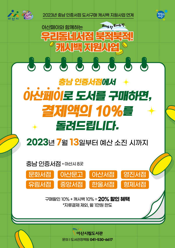 충남 아산시는 오는 13일부터 ‘2023년 우리동네서점 북적북적 캐시백 지원사업’을 시행한다고 3일 밝혔다.