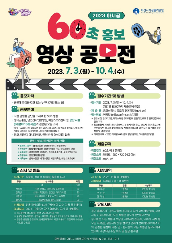 [충청뉴스 박동혁 기자] 아산시시설관리공단(이하 공단)은 오는 10월 4일까지 ‘2023 아시공 60초 홍보 영상 공모전’을 진행한다고 3일 밝혔다.