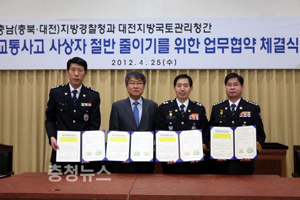 충남경찰청(청장 정용선)에서는 25일 오후 대회의실에서 대전·충북지방경찰청, 대전지방국토관리청과 상호 협력해 ‘교통사고 사상자 절반 줄이기’ 국정과제를 동공으로 추진하는 업무협약(MOU)을 체결했다.