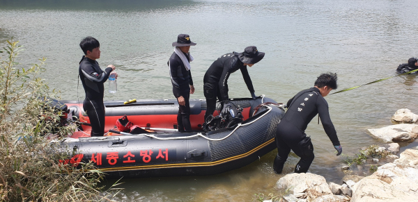 이번 훈련은 국지성 호우 등에 따라 금강에서 구조대상자가 실종된 상황을 가정해 진행됐으며, 훈련에는 세종소방서 119구조대 19명과 드론, 모터보트, 소방차량 등 20여 종의 소방장비가 투입됐다.