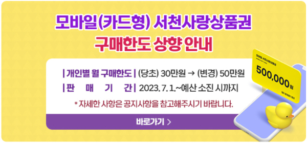 [충청뉴스 서천 = 조홍기 기자] 서천군이 7월부터 모바일 서천사랑상품권의 월 구매 한도를 기존 30만원에서 50만원으로 상향한다고 밝혔다.