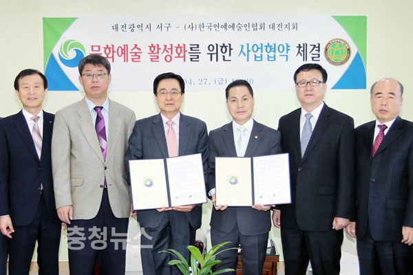대전시 서구(구청장 박환용)는 지난 27일 지역문화예술 활성화와 문화예술 사업의 공동추진을 위해 (사)한국연예예술인협회 대전광역시지회(지회장 주정관)와 ‘문화사업 협약’을 서구청 다목적실에서 협약을 체결했다.
