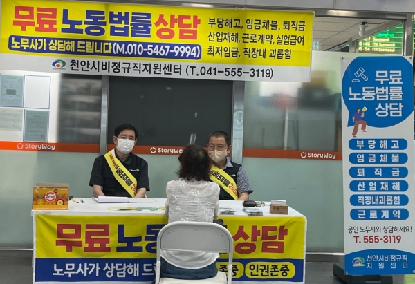 지난 1년간 센터는 334건의 무료 노동법률 상담을 진행했고, 천안역 대합실에 찾아가는 노동상담소를 작년 11월부터 월 2회 운영해 비정규직 노동자의 권리구제를 위해 힘썼다.
