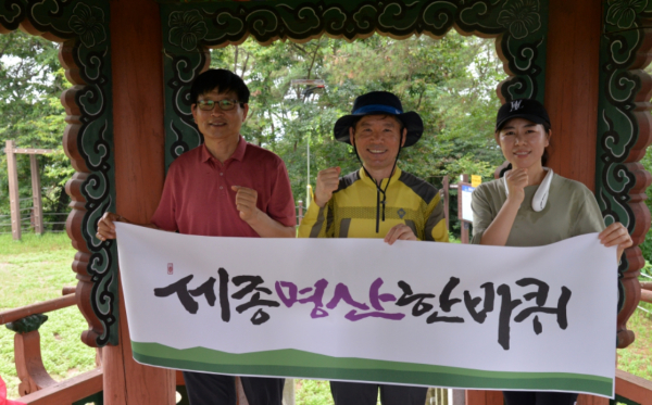세종시 명산을 기행하는 세종명산한바퀴는 9일 여덟 번째 산행지 황우산을 찾았다. 이날 산행은 캘리그라퍼 김순자 청보리 대표, 세종시 이은수 문화유산과장, 최형순 충청뉴스 취재본부장 등 네 명이 함께 했다.