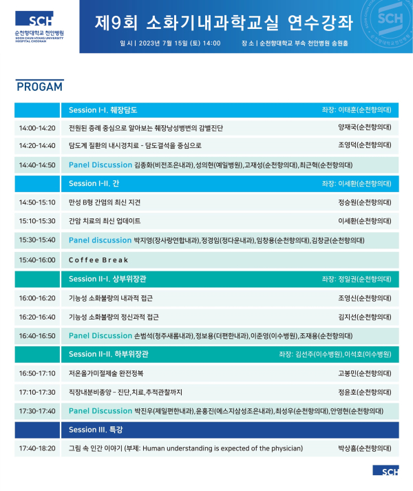 두 번째 세션에서는 ‘상부위장관’을 주제로 ▲기능성 소화불량의 내과적 접근 ▲기능성 소화불량의 정신과적 접근과, '하부위장관'을 주제로 ▲저온올가미절제술 완전정복 ▲직장내분비종양-진단, 치료, 추적관찰까지 등을 다룬다.