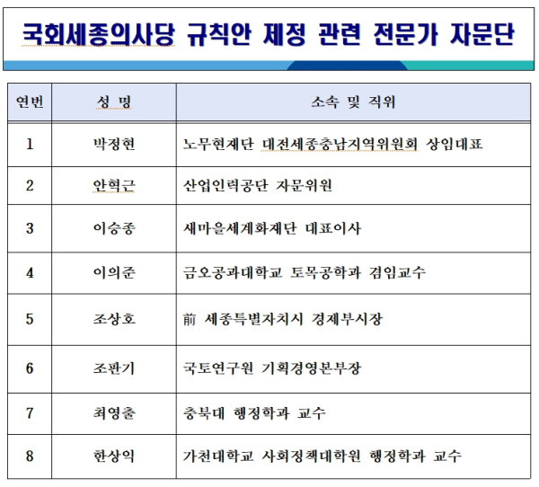 전문가 자문단에게 전달된 안내문에는 자문단 현황과 국회 세종의사당 규칙안이 첨부됐다. 아울러 규칙안 관련 의견 진술을 준비하라는 요청도 받았는데, 7월 중에 규칙안 심사를 위한 회의 개최가 논의될 가능성이 있고, 회의 일정이 촉박하게 정해질 수 있음을 공지했다.