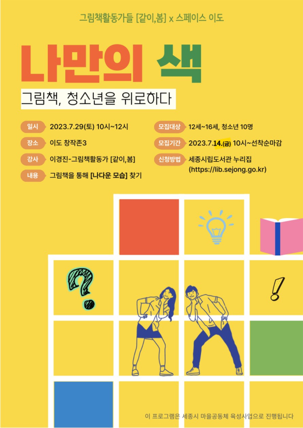 해당 프로그램은 ‘색’과 관련된 그림책을 통해 나를 알아가는 시간으로, ‘2023년 세종시 마을공동체 사업’에 선정된 그림책 활동가들 ‘같이, 봄’에서 진행한다.