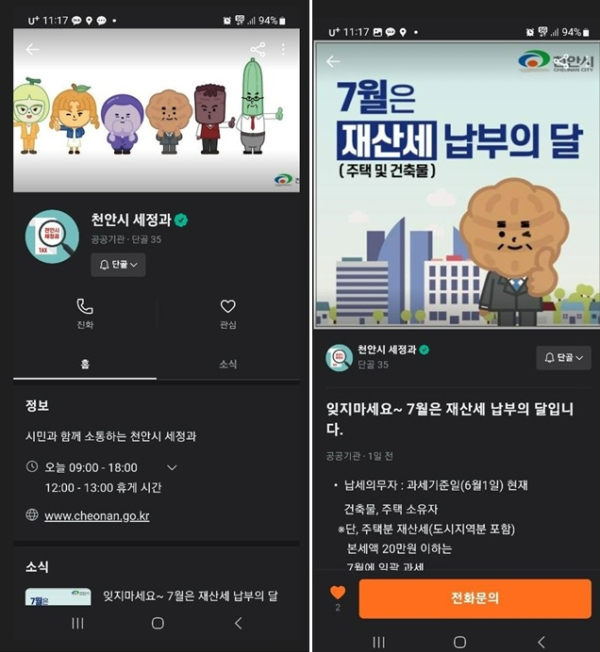시에 따르면 시 세정과는 ‘시민과 함께 소통하는 천안시 세정과’를 표어로 삼고 지난 6월 공식 프로필을 개설했다. 시범 운영 기간을 거쳐 본격적인 세정정보 서비스를 제공할 예정이다.