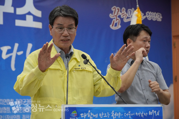 김돈곤 청양군수가 “대청댐 방류에 따른 금강 수위 상승 때문에 정산면 등 4개 지역에 피해가 심각하다”고 밝혔다/사진 권상재 기자