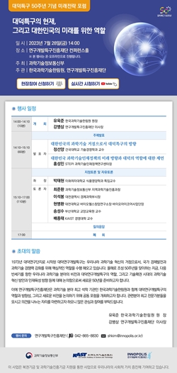 포럼은 '대덕특구의 현재, 그리고 대한민국의 미래를 위한 역할'을 주제로 다음 반세기를 향한 우리나라 과학기술분야의 비전과 대덕특구의 역할, 그리고 기술패권 시대의 과학기술 혁신방안과 인재육성 방향 등을 폭넓게 논의할 예정이다.
