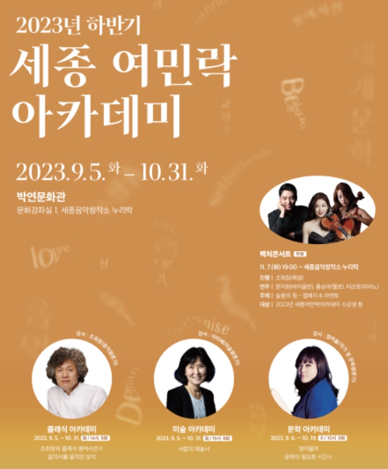 [충청뉴스 최형순 기자] 세종시문화재단은(대표이사 김종률) 2023년 하반기 ‘세종여민락아카데미’ 정기강좌 수강생을 모집한다.