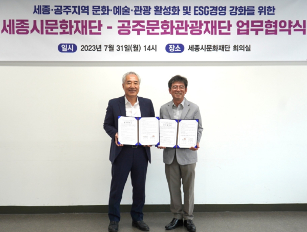세종시문화재단에서 진행된 이번 협약식에서 김종률 세종시문화재단 대표이사와 이준원 공주문화관광재단 대표이사는 세종시와 공주시의 문화·예술·관광 활성화와 ESG 경영을 위해 상호 협력하기로 했다.