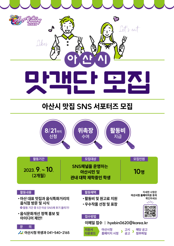 기타 자세한 내용은 아산시청 누리집 고시‧공고에서 ‘아산시 맛객단’을 검색하면 확인할 수 있고, 지원서 다운로드도 가능하다.
