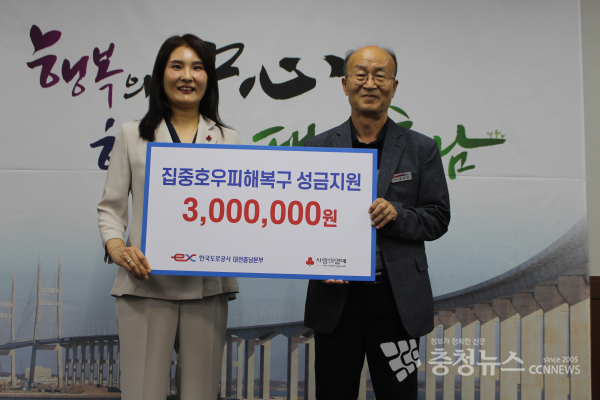 [충청뉴스 최형순 기자] 한국도로공사 대전충남본부(본부장 박진원)는 최근 집중호우로 큰 피해를 입은 지역의 신속한 피해복구와 이재민을 위한 성금 300만원을 2일 대전사회복지공동모금회에 전달했다고 밝혔다.