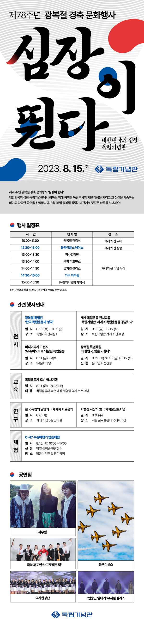 또한 천안시와 함께 공동으로 추진하는 ‘2023 천안 K-컬처 박람회’는 11~15일 독립기념관 전역에서 열리며, 독립유공자 후손 역사기행 등 다양한 교육사업도 8월 중 진행된다.