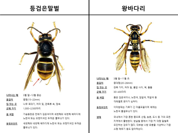 한편, 세종시에 가장 많이 나타나는 벌은 2019년 환경부 생태계교란 생물로 지정된 외래종 ‘등검은말벌’과 대형 말벌과 생김새가 유사한 ‘왕바다리’다.