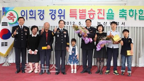 이희경 경사는 대전청주에서 연쇄 부녀자 납치범으로 공개수배된 길모씨가 논산에서 택시강도 후 도주 중이던 것을 신속히 검거하는성과를 올려 그 공적을 인정받아 경사에서 경위로 1계급 특진하는 영광을 얻었다.