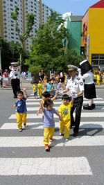 ▲ 포돌이포순이와 함께 어린이들이 안전하게 길건너기 실습을 하고 있다.