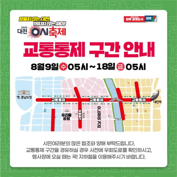 [충청뉴스 김용우 기자] 대전시는 11일 개막하는 ‘대전 0시 축제’ 행사 준비 관계로 9일 새벽 5시부터 대전역에서 옛 충남도청 구간 중앙로와 대종로 일부 구간의 차량을 전면 통제한다고 밝혔다.