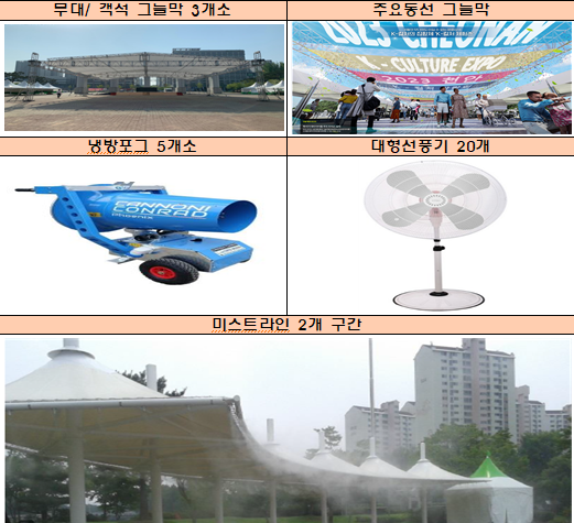 추가로 냉방버스 2대를 상시 운영하고, 대형선풍기 20개와 주요동선 2개 구간에 미스트 라인을 설치했다.