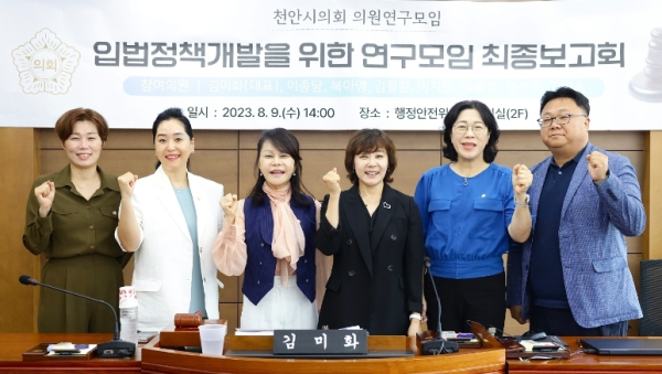[충청뉴스 박동혁 기자] 충남 천안시의회는 ‘입법정책 개발을 위한 연구모임’이 9일 행정안전위원회 회의실에서 연구용역 최종보고회를 열었다고 밝혔다.