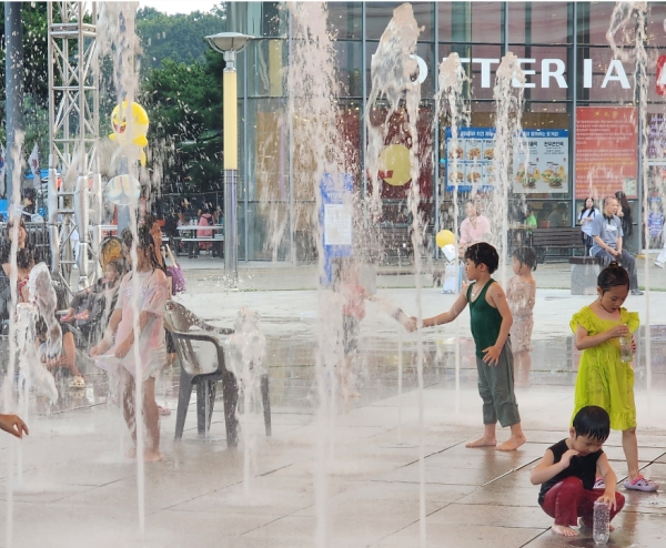 웰컴존 앞 분수대에서 더위를 식히는 아이들/박동혁 기자
