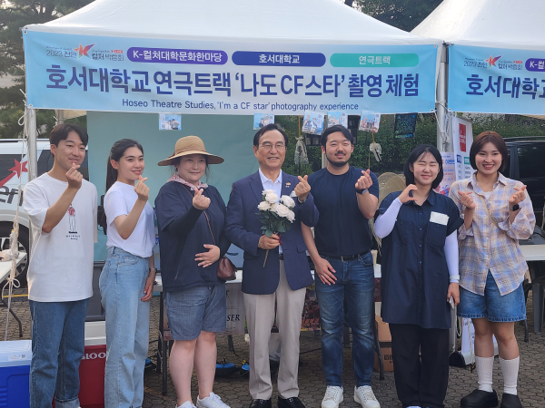 호서대 체험존에서 관계자들과 기념사진을 찍는 박상돈 시장(가운데)/박동혁 기자