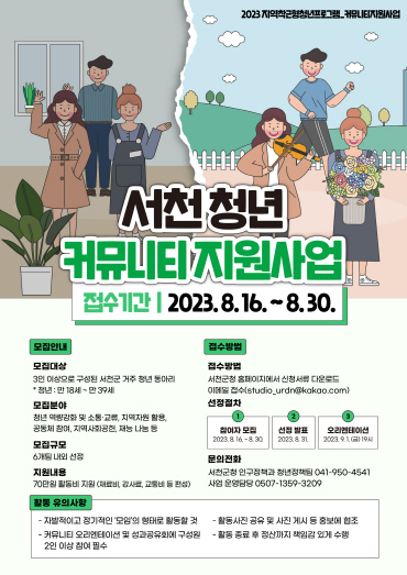 [충청뉴스 서천 = 조홍기 기자] 서천군이 지역 청년들의 네트워크 형성 및 교류 활성화를 도모하고자 오는 30일까지 청년 동아리 지원사업 참여자를 모집한다.