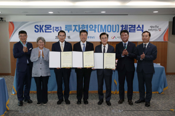 김태흠 충남지사는 16일 도청 상황실에서 지동섭 SK온 대표이사, 이완섭 서선시장과 MOU를 체결했으며, 김명숙 도의회 기획경제위원장도 참석해 기업의 성공적인 투자를 도의회도 지원하겠다고 밝혔다.