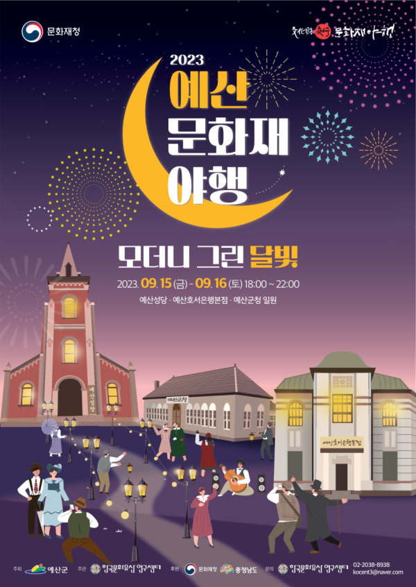 예산 문화재 야행은 예산군이 주최하고 한국문화유산연구센터가 주관하며, 올해 9월 15~16일간, 예산군 예산읍 예산리 일원에서 18시∼22시까지 개최한다.