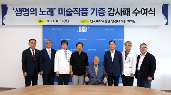 단국대병원에 따르면 지난 17일 병원 암센터에서 진행된 감사패 전달식에는 김병종 화백과 이명용 단국대병원장을 비롯해 장충식 학교법인 단국대학 명예이사장, 김수복 단국대 총장 등이 참석했다.