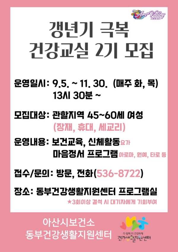 아산시 동부건강생활지원센터, ‘갱년기 극복 건강교실’ 접수