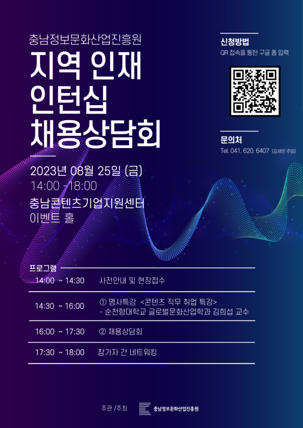 [충청뉴스 박동혁 기자] 충남정보문화산업진흥원(이하 진흥원)은 ‘2023 지역 인재 매칭 인턴십 채용상담회를’ 진행한다고 21일 밝혔다.